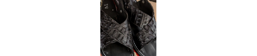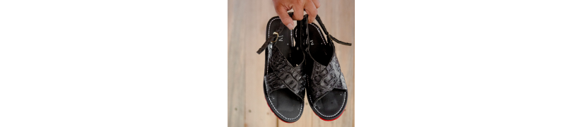 Huarache artesanal fabricado con piel original de caimán en color negro tono semi mate. Planta de piel de res